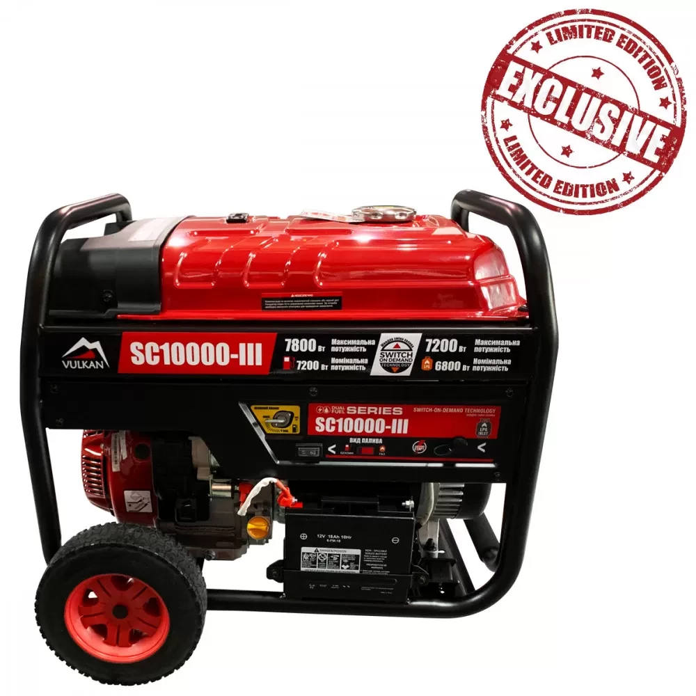 Генератор Генератор бензиновий з Опис Генератор газобензиновий Vulkan SC10000-III (SC10000-III) Газобензиновий генератор Vulkan SC10000-III- пристрій для забезпечення електричним струмом обладнання та електроприладів, в умовах, коли немає можливості скористатися іншими джерелами електроенергії. Електростанція Vulkan SC10000-III здатна працювати від двох видів палива: бензину та зрідженого газу LPG (пропан-бутану). Призначення: використовується для відновлення подачі електрики у разі збоїв роботи електромережі. Завдяки 2 режимам роботи і високій потужності може підходити для застосування як в промисловості, так і в побуті. Переваги електрогенератора Vulkan SC10000-III Універсальність палива Генератор Vulkan SC10000-III має двигун, здатний працювати у двох режимах. У першому режимі електростанція живиться від бензину з октановим числом 92 або 95. Завдяки цьому, максимальна вихідна потужність досягає 7,8 кВт. Інший режим є більш економічним і екологічно чистим, оскільки SC10000-III починає працювати від зрідженої суміші газів LPG (пропан-бутану). Потужність на виході у такому разі становить до 7,2 кВт. Для зручності, зміна режиму роботи здійснюється одним великим перемикачем, який винесений на корпус генератора. Зверніть увагу, що генератор Vulkan SC10000-III не призначений для роботи від газової магістралі! Продумана конструкція Встановлена панель управління відрізняється простотою і доступна для використання навіть не досвідченому користувачеві. На ній розміщені розетки 220В на 16А і 32А, клеми для підключення аккумулятора з напругою 12В, замок запалювання та лічильник опрацьованих мото-годин. Електростанція SC10000-III змонтована на надійній сталевій рамі з діаметром 38 мм і тому витримує великі навантаження на корпус без пошкодження. Для полегшення транспортування, генератор Vulkan у комплекті має пару коліс діаметром 22 см. Якісні комплектуючі У газобензиновому генераторі Vulkan SC10000-III для стабілізації напруги встановлено надійний синхронний альтернатор. Він має якісну мідну обмотку і дозволяє згладити колівання на виході до ±1%. Завдяки такій конструкції, генератор має підвищений ресурс роботи і менше перегрівається. Електростанція має бак підвищеної ємності на 25 л для бензину. Час роботи без дозаправки становить від 6 до 9,5 години, в залежності від обраного топлива і підключеного навантаження. Комплект поставки: генератор Vulkan SC10000-III- 1 шт шланг високого тиску з редуктором - 1 шт вилка 16А тип Schuko- 1 шт вилка 32А триполюсна - 1 шт комплект кабелів 12В DC- 1 шт колеса - 2 шт з експлуатації - 1 шт інструкція по швидкому запуску (АНГЛ) - 1 шт Характеристики Генератор газобензиновий Vulkan SC10000-III (SC10000-III) Тип паливагаз / бензин Номінальна потужність, кВт6.8 / 7.2 Максимальна потужність, кВт7.2 7.8 Робоча напруга, В220 Кількість фаз1 Частота, Гц50 Тип запускуручний/електростартер Тип альтернаторасинхронний Тип двигуна4-тактний Модель двигунаSENCI AP460F Об'єм двигуна, см3459 Потужність двигуна, к.с.16 Обсяг паливного бака 6 В2. Об'єм оливи, л1.1 Година безперервної роботи, рік9.5 Виконаннявідкрите Тип охолодженняповітряне AVR (авторегулятор напруги)так Ступінь захистуIP23 Рівень шуму, дБ97 Габарити ВхШхГ, см72.5х55.5х61 Вага коробки