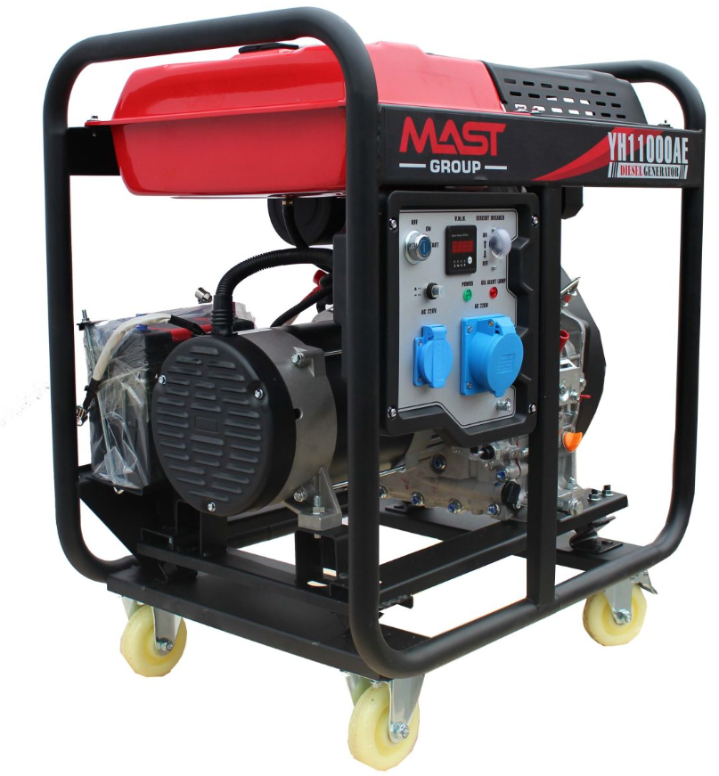 Дизельний генератор MAST GROUP YH11000AE - потужний генератор для автономної та аварійної подачі електроенергії для будівельних майданчиків. Підходить для постійного та тривалого використання. Забезпечити електрикою усі прилади будинку (у тому числі енергоємні), а на будівельному майданчику – усі інструменти. Використовується для енергонезалежності заміських будинків, офісів, торгових точок в аварійних ситуаціях на лініях електропередач, а також як мобільне джерело електрики для комунальних та дорожніх служб.