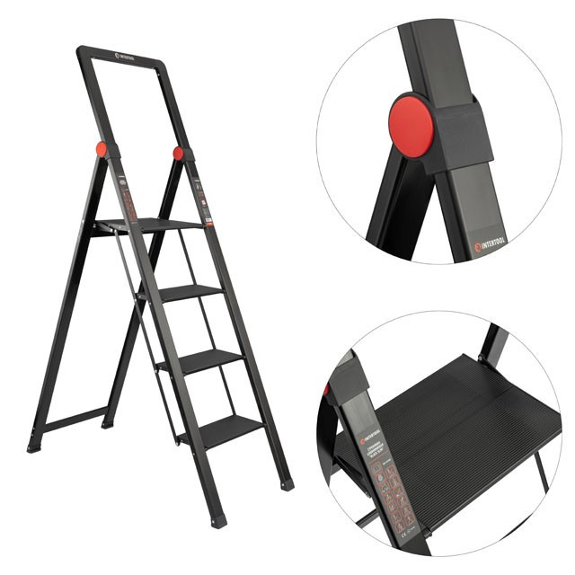 • Стремянка алюминиевая "Black Slim", 4 ступени, высота верхней ступени 912 мм, 150 кг, STORM INTERTOOL LT-5004