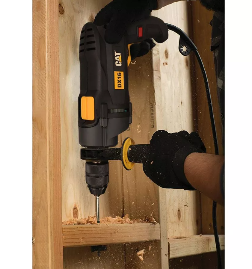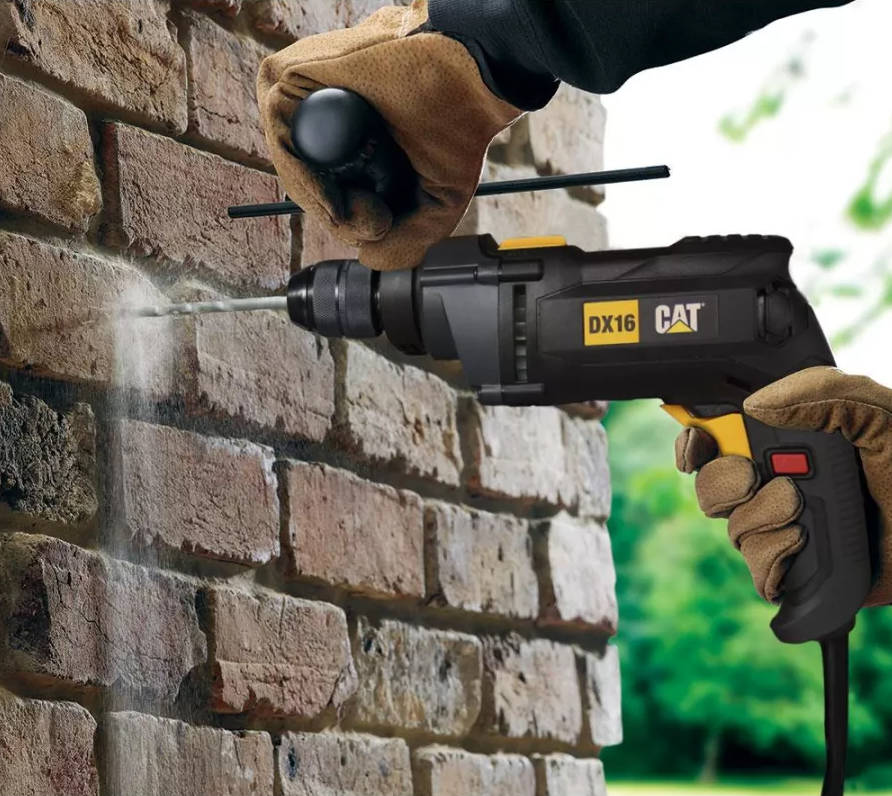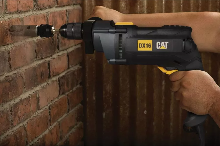 Двигун потужністю 850 Вт з регулюванням швидкості обертів, допомагає виконувати найважчі завдання та обробляти різні матеріали: дерево, метал, бетон, цегла. Швидкозатискний патрон забезпечує зручну заміну свердел діаметром до 13 мм. А завдяки прогумованій додатковій та основній ручці та обмежувачу глибини свердління, працювати з CAT DX16 дуже зручно та безпечно.