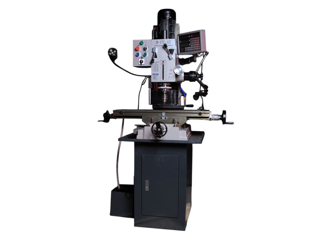 Фрезерно-свердлильний верстат - MAST M-FR 45 - це універсальне обладнання для фрезерування, свердління, розсвердлювання, розточування, зенкування і нарізування різьблення в металевих деталях. Потужність двигуна 1,5 кВт забезпечує продуктивну роботу з чорними та кольоровими металами, а регулювання швидкості обертання шпинделя в межах 80-1250 об/хв дозволяє встановити параметри обробки відповідно до особливостей матеріалу. Цифрова індикація по 3 осях забезпечує високу точність, повторюваність та контрольованість обробки.