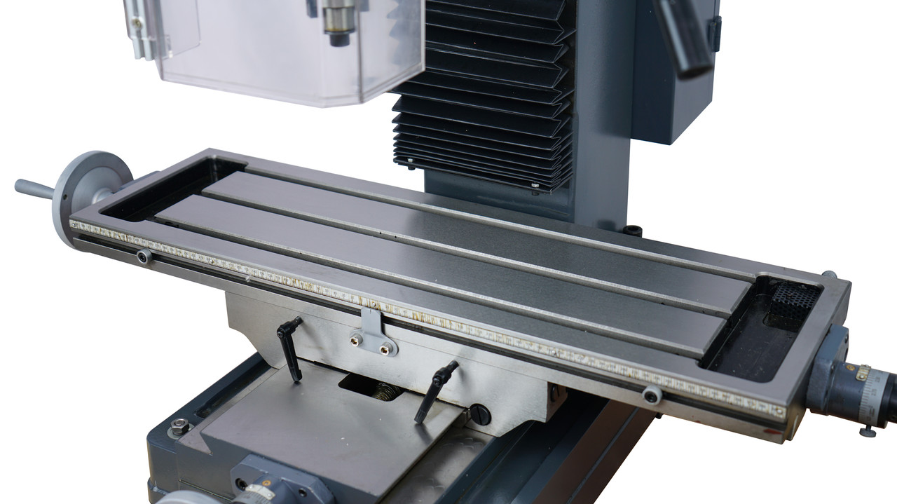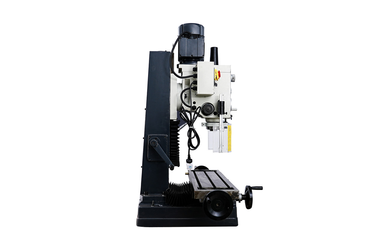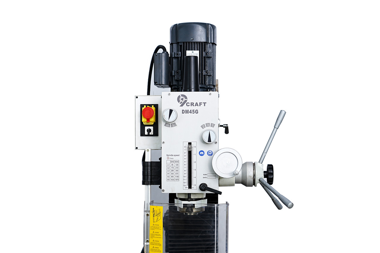 Настільний свердлильно-фрезерний верстат 9craft DM45G 1500W оснащений механічною коробкою передач для зміни швидкості обертання шпинделя. Даний верстат є промисловою моделлю. Масивна чавунна конструкція у поєднанні із загартованими та шліфованими напрямними типу «ластівчин хвіст» дозволяє здійснювати свердління та фрезерування з високою точністю та жорсткістю. Робочі поверхні мають шабрування. Фрезерна голова дозволяє змінювати кут нахилу шпинделя ліворуч і праворуч від 0 до 90 градусів для виконання широкого спектра завдань. Робочий стіл великого розміру дозволяє обробляти мало- та великогабаритні деталі. Форма розрахунку - готівка, безготівковий розрахунок, оплата на картку, післяплата, розстрочка, кредит від Приватбанку • 1 рік гарантії • Гартовані та шліфовані напрямні • 1500W – потужність двигуна • Асинхронний електродвигун 220В • Ліве/праве обертання шпинделя • 6 швидкостей діапазон 95-1420 об/хв • Аналогова індикація переміщення пінолі · Шпіндель оснащений механізмом мікроподачі • Розмір столу 800x240 мм. • 14 мм ширина Т-пазу • 560 мм Переміщення по осі X • 230 мм Переміщення по осі Y • 130 мм – хід пінолі • 260 мм відстань від шпинделя колони • 470 мм максимальна відстань від шпинделя до столу • 50 мм мінімальна відстань до столу • 300 мм хід голови • 45 мм максимальний діаметр розсвердлювання отворів у сталі • 32 мм максимальний діаметр обробки кінцевою фрезою • 80 мм максимальний діаметр обробки торцевою фрезою • Функція нарізки різьблення + +-90 градусів нахил голови • 320/380 кг вага немає /брутто • MT4 конус шпинделя • Розмір упаковки 80x80x110 см • Направляючі закриті гармошкою Комплектація: · Верстат у зборі · Набір інструментів для роботи та обслуговування · Конус патрона та патрон свердлильний