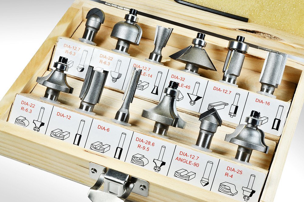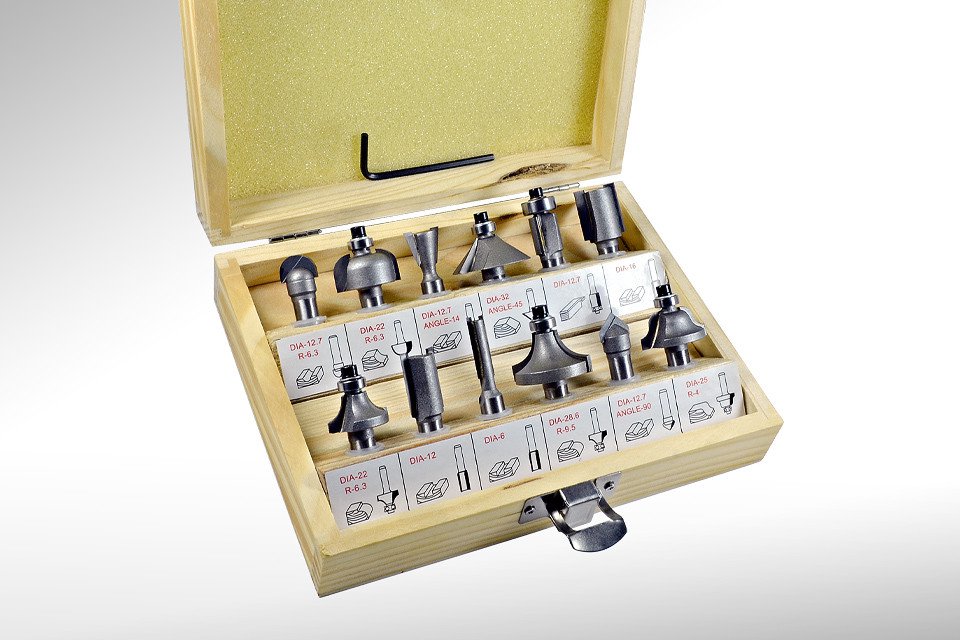 Завдяки набору з 12 фрез можна виконати неймовірну кількість робіт по дереву: створення вибірки, отворів, розкрою дерев'яних матеріалів для теслярських і інших робіт. Фрези поставляються в дерев'яній коробці невеликих розмірів для зручного зберігання.