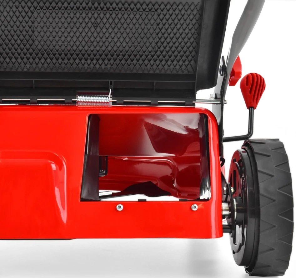 Косилка имеет металлический корпус с порошковым покрытием, благодаря которому она устойчива к ржавчине, царапинам и сколам краски. Его современный дизайн позволяет лучше использовать возможности устройства. Устройство характеризуется современным дизайном, компактным прочным стальным корпусом и удобной ручкой с мягкой отделкой, облегчающей маневрирование устройством. Косилка имеет центральную систему регулировки высоты скашивания от 2,5 до 7,5 см. Косилка оснащена сетчатой корзиной на 60 литров с пылезащитным чехлом и индикатором заполнения травой.