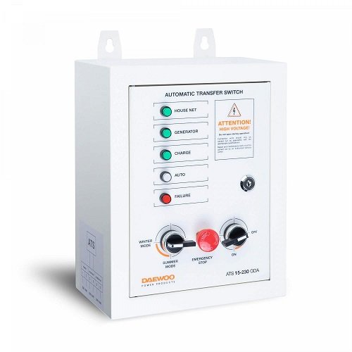 Блок автоматичного керування генератором Daewoo ATS 15-220 GDA - пристрій, що забезпечує автоматичний запуск генераторної установки під час падіння напруги основної мережі або припинення подачі електроенергії. Коли відновлюється енергопостачання, автоматика переводить харчування споживачів на зовнішню мережу і відключає мініелектростанцію.