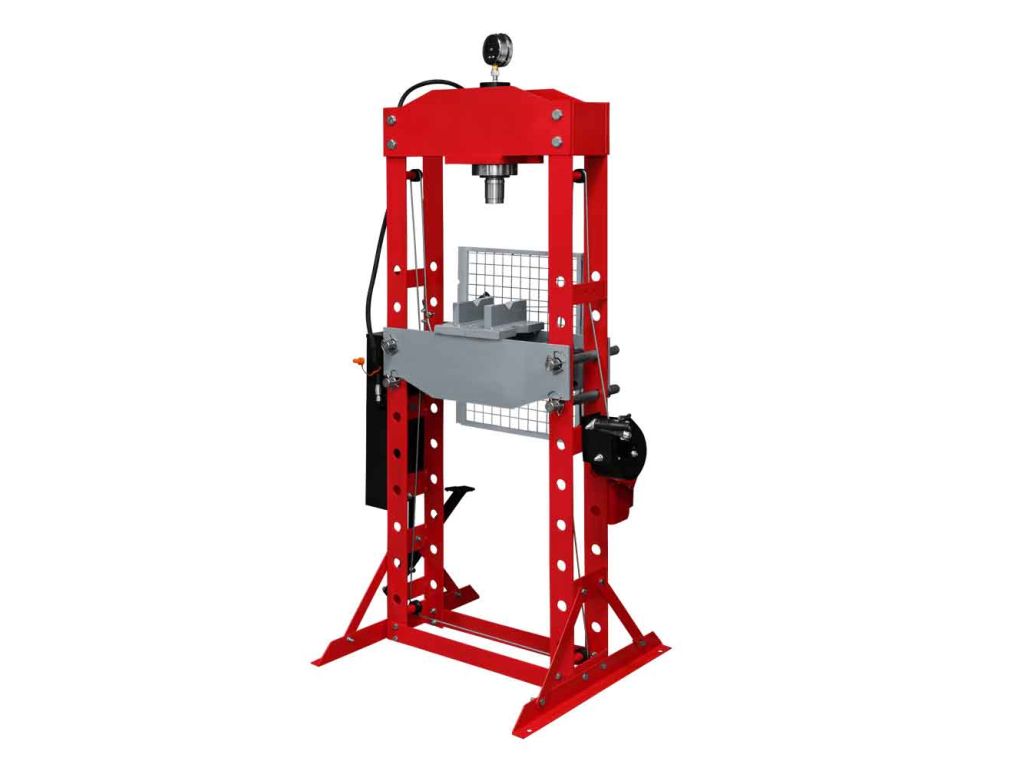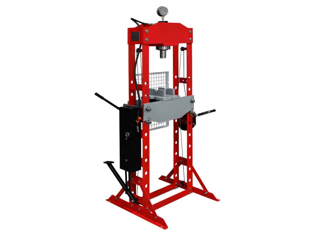 Опорний стіл регулюється за висотою від 166 до 1126 мм за допомогою отворів на стійках. Відведення поршня автоматичне, що суттєво спрощує та прискорює робочий процес. Розташування преса вертикальне, також можливе горизонтальне переміщення прес-блоку. Міцна, зварена, стійка до деформацій конструкція з антикорозійним покриттям гарантує надійну, довготривалу службу. Компактний розмір дозволяє зручно встановити прес у невеликому приміщенні. Цей гідравлічний прес з металу відповідає європейським стандартам якості та безпеки, що підтверджується сертифікатом CE.