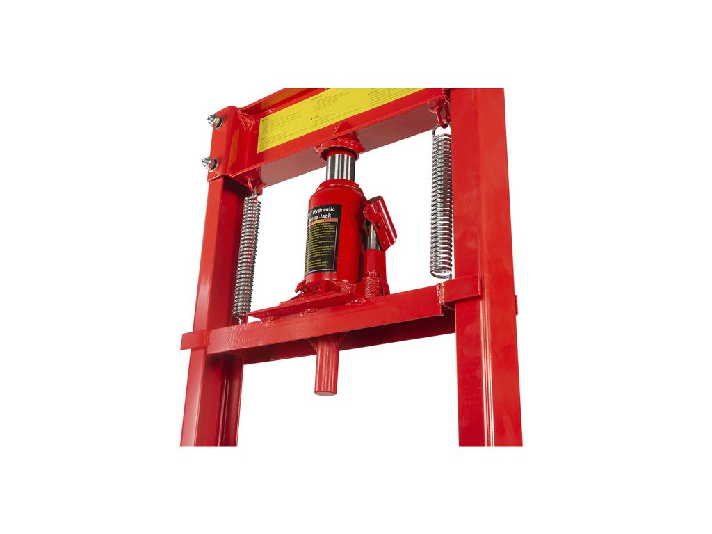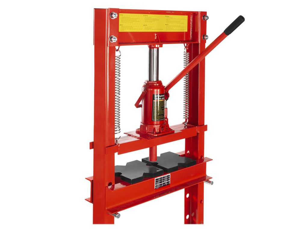 Пляшковий домкрат дозволяє легко відрегулювати висоту опорного столу під заготівлю, що дозволяє працювати з деталями різної висоти. Автоматичне повернення поршня у вихідне положення за допомогою пружини спрощує процес обробки та економить робочий час. Для фіксації заготовок прес оснащений двома призмами розміром 150х150х150мм. Компактний розмір і вага 42 кг дозволяють зручно використовувати цей гідравлічний прес для майстерні з обмеженою робочою площею.