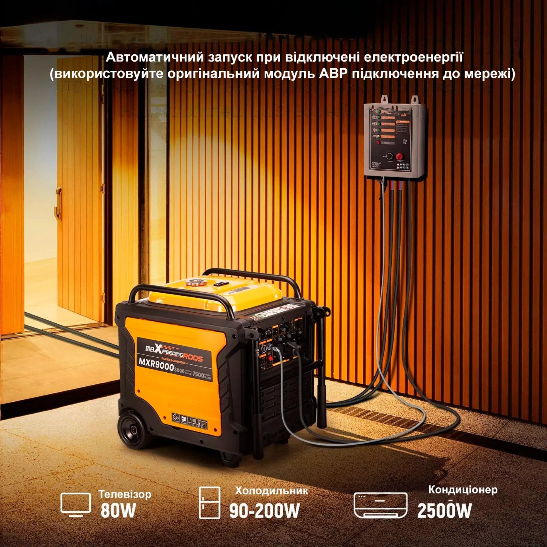 Інверторний генератор MXR9000 не тільки найпотужніший генератор в лінійці MaXpeedingRods, але й найпотужніша модель генератора з інверторною технологією в Україні. Крім загальновідомих переваг генераторів MaXpeedingRods (беззаперечна якість, інверторна технологія з правильною синусоїдою, мідна обмотка, мінімальні витрати пального), модель MXR9000 оснащена ATS модулем (автоматичний запуск генератора в момент вимкнення центрального електропостачання). Це ідеальний варіант для забезпечення електрикою приватного будинку, офісу, магазину в моменти аварійного відключення. Ви можете подвоїти потужність, використовуючи 2 паралельно підключені генератори, і отримати 15 кВт чистої енергії.