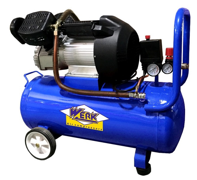 Компресор Werk VBM -50N – це масляний двоциліндровий прилад професійного класу. Дана модель оснащена однофазним електромотором потужністю 2,23 кВт з термозахистом та автоматикою повторного пуску. Агрегат має компактні розміри та його вага становить 32кг. Для зручності транспортування виробником встановлені два колеса та ергономічна ручка.