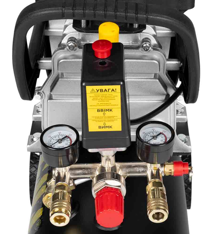 • Два манометри дозволяють контролювати тиск усередині ресивера та тиск на виході