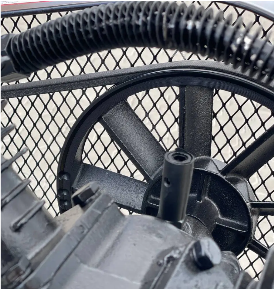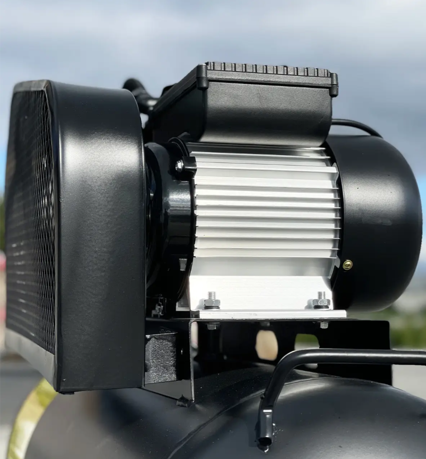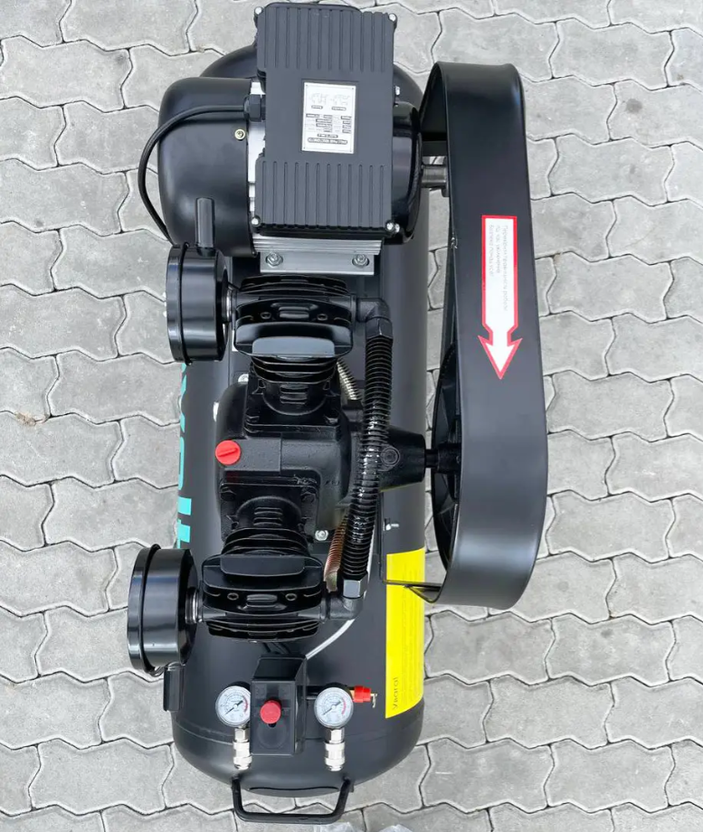 Ремінний привід між двигуном потужністю 3,0 кВт та головкою маховика підвищує надійність. Завдяки двом поршням компресор працює тихо, а ресивер на 100 літрів витримує тиск до 8 бар, видаючи 500 л/хв.