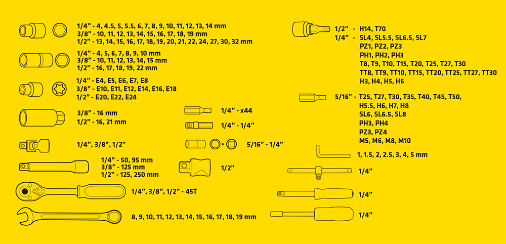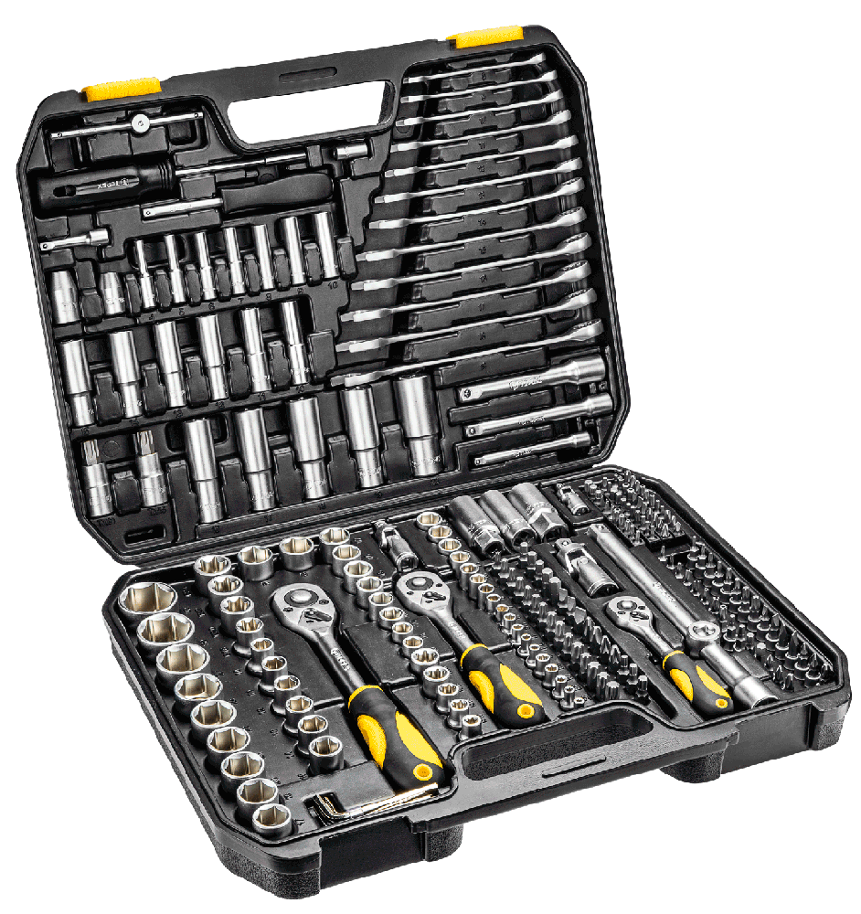 Набір накидних ключів 1/2", 3/8" та 1/4" TOPEX (арт. 38D852) складається з 219 елементів, виготовлених із високоякісної сталі. До складу набору входять тріскотки 1/2", 3/8" і 1/ 4" (західний (храповий) механізм на 45 зуба підвищеної міцності) з ергономічними двокомпонентними пластиковими руків'ями. наконечників (у тому плоскі, хрестовидні, шестигранні, Torx). в асортименті. Ключі постачаються в практичній і добротній валізі з зручною ручкою. Марка TOPEX адресована майстрам. .: 13, 14, 15, 16, 17, 18, 19, 20, 21, 22, 24, 27, 30, 32 мм, довгі насадки 1/2" 5 шт.: 16, 17, 18, 19, 22 мм, насадки Е 1/2" 3 шт.: E20, E22, E24; насадки до свічок 1/2" 16 мм і 21 мм; підовжувачі 1/2": 125 мм і 250 мм; , T70; тріскотка 1/2", 45 зубців, ключі ріжково-накидні 12 шт.: 8, 9, 10, 11, 12, 13, 14, 15, 16, 17, 18, 19 мм; тримач для наконечників-бітів 1/2" ", 5/16"; насадка до свічок 3/8” 18 мм, насадка шестигранна 3/8” 10 шт.: 10, 11, 12, 13, 14, 15, 16, 17, 18, 19 мм; насадка шестигранна 3/8", довга 6 шт. 10, 11, 12, 13, 14, 15 мм; насадка Е, 3/8" 6 шт.: E10, E11, E12, E14, E16, E18; підовжувач 3/8” 125 мм, шарнір універсальний 3/8”; тримач до наконечників-бітів 3/8”, 5/16”; тріскотка 3/8” 45 зубів; насадки шестигранні 1/4" 13 шт.: 4, 4.5, 5, 5.5, 6, 7, 8, 9, 10, 11, 12, 13, 14 мм, насадки 1/4" довгі 7 шт.: 4, 5 6, 7, 8, 9, 10 мм; підовжувач 1/4” 100 мм, підовжувач 1/4” 50 мм, насадки E 1/4”, 5 шт.: E4, E5, E6, E7, E8; шарнір універсальний 1/4"; тріскотка 1/4", 45 зубців; ключі шестигранні 10 шт.: 1,27 мм (x2), 1,5 мм (x2), 2 мм (x2), 2,5 мм, 3 мм, 4 мм, 5 мм; тримач для наконечників-бітів 1/4"; ручка викруткова 1/4"; комір із рухомим квадратом 1/4", насадка 1/4", 30 шт. із наконечником-бітом: плоским (під прямий шліц): 4, 5.5, 6.5, 7 мм, PZ0, PZ1, PZ2, T8, T9, T10, T15, T20, T25, T27, T30, TT8, TT9, TT10, TT1 , TT20, TT25, TT27, TT30, H3, H4, H5, H6, PH0, PH1, PH2; наконечники-біти 30 мм, 30 шт. М10, М12, Т40, Т45, Т50, Т55, Т60, SL8, SL10, SL12; наконечники-біти 25 мм 44 шт.: H3, H4, H5, H6, H3 (з відваром), H4 (з відваром), H5 (з відваром), H6 (з відваром), PH1, PH2, PZ1, PZ2, T8 , T10, T15, T20, T25, TT8, TТ10 (x2), TT15, TT20(x3), TT25(x2), TT40, M5, M6, M8, плоскі 4 мм (2х), 5 мм, 5,5 мм ; 6 мм; 8 мм; TRI-WING 1, 2, 3; TORQ 6, 8, 10, S1, S2.
