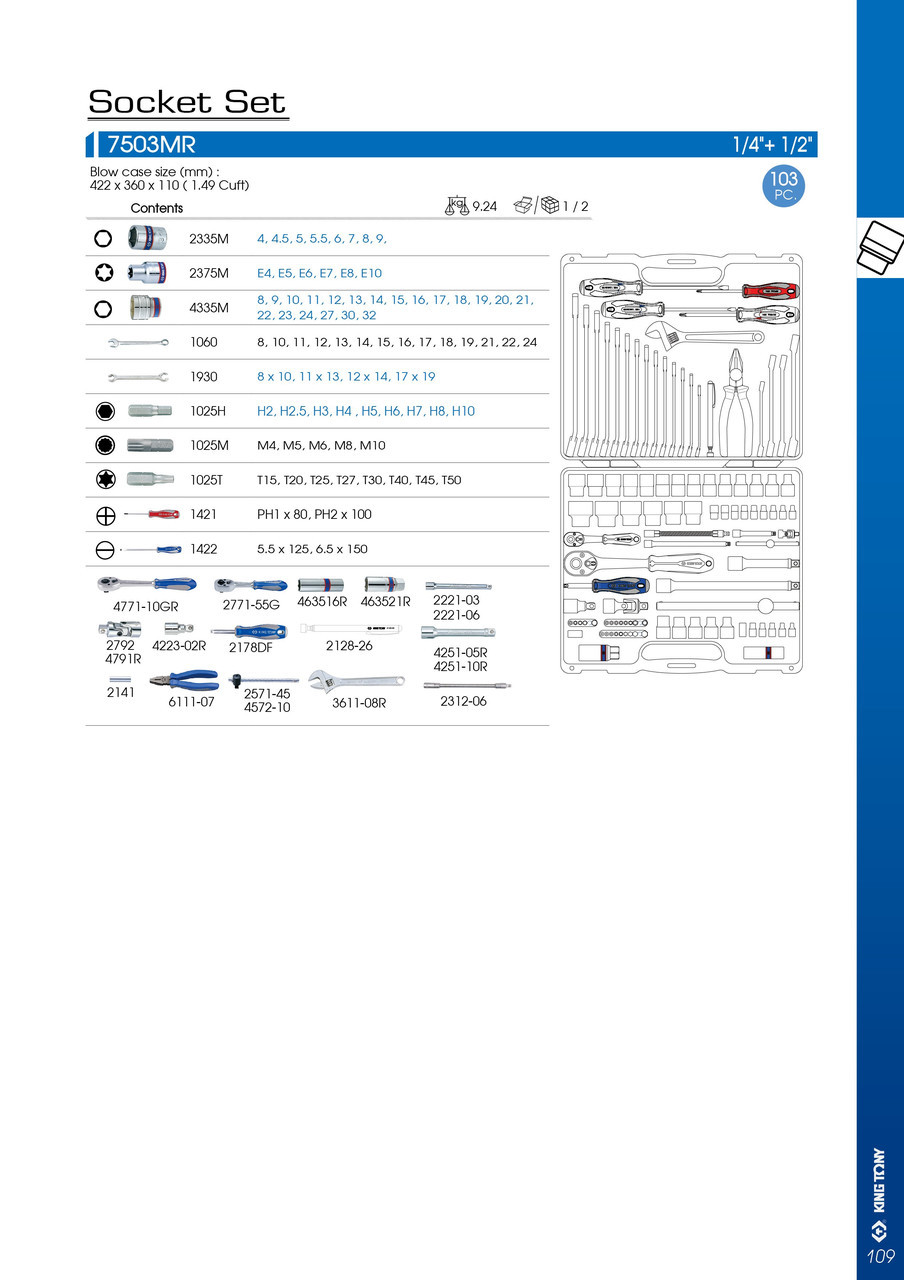 Набір інструментів 103од. 1/4"+1/2" KINGTONY 7503MR Кожен спеціаліст або просто любитель повозиться з технікою, особливо в гаражі або майстерні, мріє про якісні м міцні інструменти. Набір із 103 одиниць інструментів Ви маєте змогу придбати у нас за доступною ціною. Інструменти знаходяться в елегантному кейсі, що робить набір зручним у транспортуванні. Ці інструменти стануть Вашим надійним помічником у повсякденному житті. Що ж входить до набору інструментів? До списку інструментів цього набору включено всі основні елементи для повсякденної роботи з механікою та іншими деталями. Тут ви знайдете повноцінний набір викруток, ключів, плоскогубців. Для ефективної роботи з тріскачкою доступні торцеві головки діаметром від 6 до 32 міліметрів. Додатково є подовжувачі різних розмірів та головки свічки. За допомогою вбудованого розвідного ключа ви зможете працювати з гайками та болтами будь-якого діаметру. Додатковим помічником буде телескопічний магніт. Ці елементи сприяють будь-якій механічній роботі. Маючи такий набір будинку або в майстерні, вам не потрібні вкладення з додатковими інструментами. Наша компанія пропонує гарантію на всі деталі із запропонованого фірмового набору. Склад набору: 1/2": Свічкові головки: 6гр. 16 мм, 21 мм Головки торцеві 6гр.: 8, 9, 10, 11, 12, 13, 14, 15, 16, 17, 18, 19, 20, 21 , 22, 23, 24, 27, 30, 32 мм Кардан Тріскачка 32 зубця 250 мм (швидкий знімання) Вороток Т-подібний ковзний 250мм Подовжувач: 55, 125, 250мм 1/4": , E7, E8, E10 Головки торцеві 6гр.: 4, 4.5, 5, 5.5, 6, 7, 8, 9 мм) Біти 1/4": Н8, Н10, М4, М5, М6, М8, М10, T15, T20, Т25, T27, T30, T40, Т45, Т50. , 13, 14, 15, 16, 17, 18, 19, 21, 22, 24 Ключ розрізний: 8х10, 11х13, 12х14, 17х19. Викрутки: PH1х80 мм, SL5х50,50. 75, 150 мм Вороток Т-подібний ковзний 115мм Викрутка воріт 150 мм Магніт телескопічний Адаптер під біти 1/4" Плоскогубці комбіновані 180 мм Подовжувач гнучкий: 150мм Ключ розвідний до25мм L=200м0