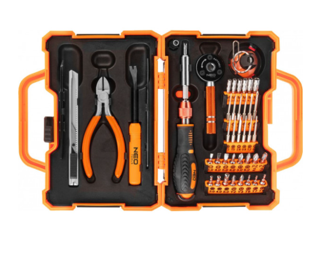 Набір NEO Tools 06-114 призначений для ремонту смартфонів та іншої техніки зі схожими елементами. А також може використовуватися для роботи з різьбовими з'єднаннями в автомобілях і побуті завдяки наявності торцевих головок і біт в комплекті. У набір включені надійні та високоякісні компоненти, що мають високі показники робочого ресурсу. Набір підійде для частого та інтенсивного застосування. Інструменти, оснащені ручками, мають зручний хват. Рукоятка прогумована, двокомпонентна і дозволить працювати навіть в умовах підвищеної вологості. Високі показники надійності та ефективності має храповий механізм. У представленому наборі налічується 47 інструментів. Є тріскачка. Мінімальний розмір торцевої голівки становить 2.5 мм, а максимальний – 5 мм. Всі інструменти виготовляються з надійної та міцної сталі CrV. Комплектуються в міцний пластиковий кейс. Серед основних переваг даного набору можна виділити його надійність та довговічність. Комплектація розширена, а кейс зручно зберігати в гаражі, майстерні чи багажнику. Стане незамінним помічником для кожного власника автомобіля чи майстра.