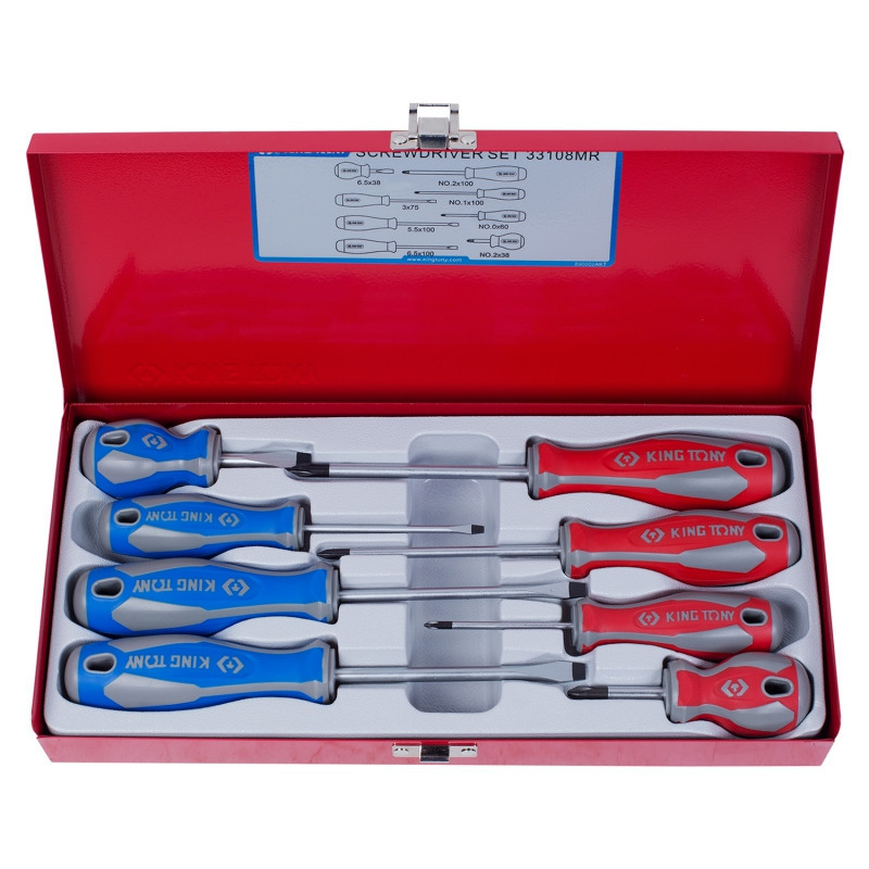 Набір викруток 8 од. KINGTONY 33108MR Викрутка (+): PH0 x 60, PH1 x 100, PH2 x 100, PH2 x 38 Викрутка (-): 3 x 75, 5.5 x 100, 6.5 x 38, 69 На 0