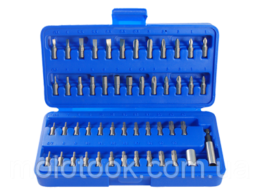 Набір біт 1/4" Біти TORX 1/4" 25мм. , T8, T9, T10, T15, T20, T25, T27, T30, T40, Т40 Біти HEX 1/4" 25мм.: H2, H3, H4, H5, H6, H7, H8 Біти хрест/шліц 1/4" 25мм: PH1, PH1, PH2, PH2, PH3, PH3, PZ1, PZ1, PZ2, PZ2, PZ3, PZ3, SL4.0, SL4.0, SL5.5, SL5.5, SL6.5, SL6.5 1/4" перехідник під біти 1/4" Перехідник хвостовик 1/4" під біти 1/4" магнітний Пластиковий кейс: 224 x 110 x 54 мм Кількість вставок (біт): 50