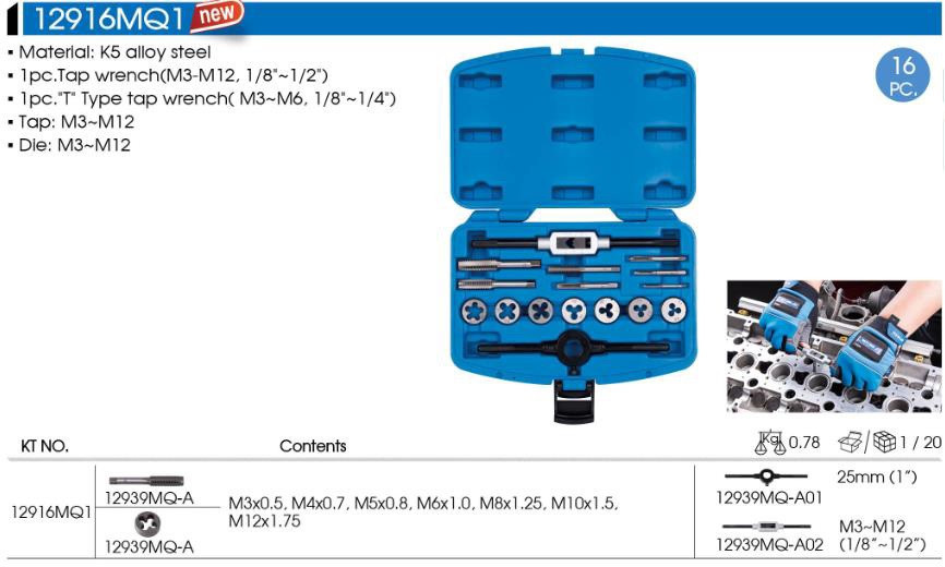 Набор метчиков и плашек метрических 16 предметов М3-М12
