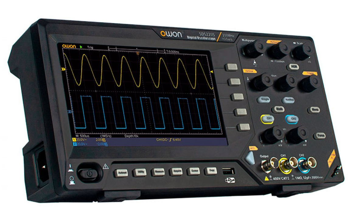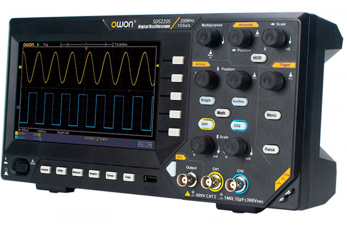 OWON SDS220 - це високопродуктивний 2-канальний цифровий осцилограф з частотою дискретизації 1 Гвиб/с, смугою пропускання 200 МГц і глибиною пам'яті 20 Мт на вимірювання, що забезпечує швидкий і точний аналіз декількох сигналів одночасно. Осцилограф підтримує різні режими збору даних, включаючи штатний режим, виявлення піків та функцію усереднення значень, а 7-дюймовий сенсорний дисплей забезпечує чітке та деталізоване відображення сигналів та дозволяє легко масштабувати та переміщувати зображення.