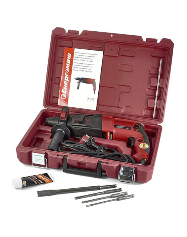 Перфоратор Енергомаш ПЕ-2526, 1200 Вт Перфоратор Енергомаш ПЕ-2526 - трирежимний горизонтальний перфоратор використовується як для свердління отворів, так і для зняття старих настінних покриттів (штукатурка, плитка). Перфоратор має гарну потужність двигуна 1200 Вт і велику силу удару 3 Дж. Додаткова передня рукоятка може повертатися на 360° для зручності в роботі. Особливості: функція реверсу, 3 режими роботи: свердління/свердління з ударом/довбання. Перфоратор ПЕ-2526 оснащений системою SDS-plus для швидкої та зручної зміни бура. Інструмент поставляється з набором оснастки у зручному пластиковому кейсі. Особливості: Патрон SDS-plus для швидкої та зручної зміни оснастки; Швидке встановлення необхідної глибини свердління; Три режими роботи: Свердління / Свердління з ударом / Довбання; Спеціальний перемикач реверсу для зменшення зносу щіток; Вимикач із кнопкою блокування; Нова розширена гарантія: 24 місяці; Комплектація: Перфоратор Енергомаш ПЕ-2526; Пластиковий кейс – 1 шт; SDS-plus свердла 5/6/8х150 мм – 3 шт; Долото – 1 шт; Мастило для хвостовиків - 1 шт; Обмежувач глибини – 1 шт; Додаткова рукоятка (встановлена) – 1 шт; Інструкція з експлуатації – 1 шт.; Основні Напруга, В 220 В Потужність що споживається 1200 Вт Енергія удару 3 Дж Режими роботи Свердління / Свердління з ударом / Удар Максимальний діаметр буріння Бетон - 26 мм / Сталь - 13 мм / Дерево - 30 мм Тип кріплення бура SDS-plus Розташування двигуна Горизонт оборотів 0-1100 об/хв Обмежувач швидкості Ні Фіксація клавіші включення Є Реверс Є Довжина мережевого кабелю, м 2 Упаковка Пластиковий кейс Вага нетто, кг 3 кг Комплектація Перфоратор, пластиковий кейс, SDS-plus свердла 5/6/8х150 мм; Мастило для хвостовиків; Обмежувач глибини; Додаткова рукоятка (встановлена); Інструкція з експлуатації; Гарантія, міс 24 Щоб купити Перфоратор Енергомаш ПЕ-2526, 1200 Вт в Києві від інтернет-магазину molotook.com.ua необхідно оформити онлайн заявку або зателефонувати за номерами, які вказані на сайті. Також ви можете замовити інші товари від інтернет-магазину molotook.com.ua за найкращою ціною та оформити доставку по всій Україні: Харків, Київ, Одеса, Запоріжжя, Львів, Дніпро, Рівне, Івано-Франківськ та інші міста України.