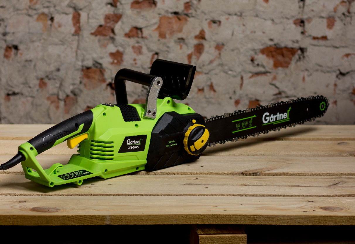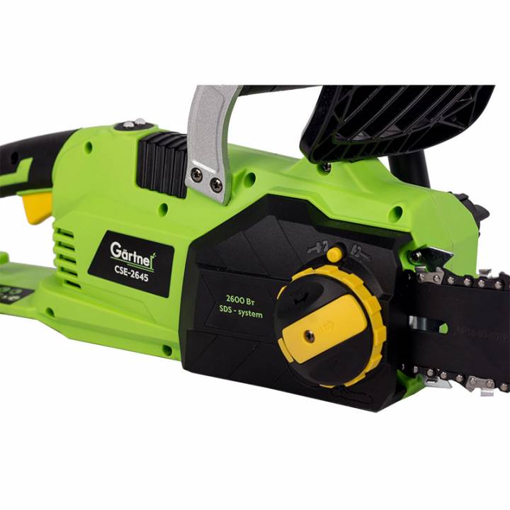 Електропила Gärtner CSE-2645 має ергономічний дизайн і обладнана системою безпеки, яка включає в себе захисний кожух і автоматичне гальмування ланцюга для безпечної та комфортної експлуатації.