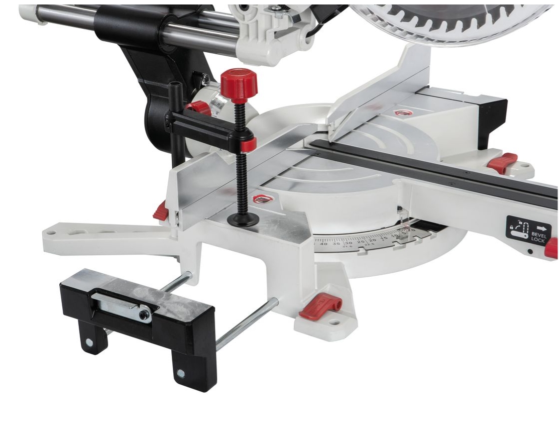 Верстат обладнаний лазерним покажчиком лінії різу, світлодіодним ліхтарем підсвічування, знімним вертикальним притиском та висувними розширювачами робочого столу з відкидними кінцевими упорами, причому стопори розширювачів із зручним ексцентриковим механізмом.