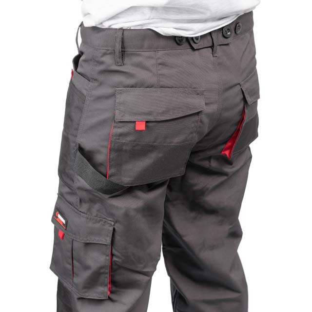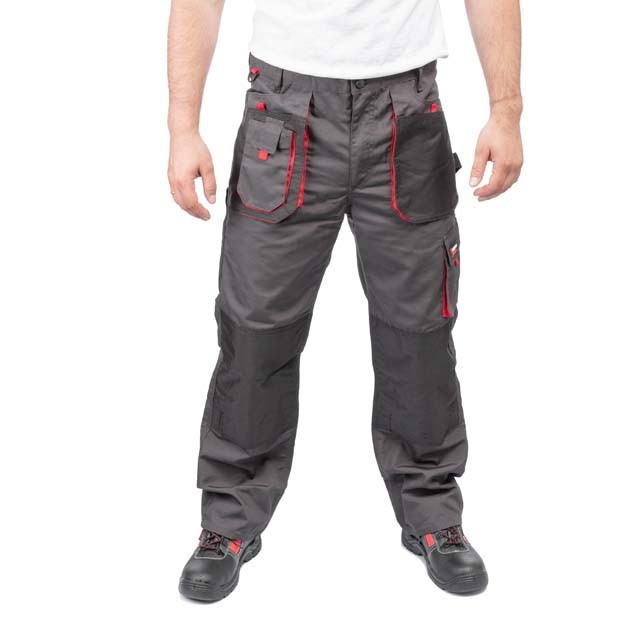 Робочі штани темно-сірого кольору виготовлені із міцної тканини: 80% поліестер та 20% бавовна із щільністю 260 г/м². Наявність безлічі кишень дозволяє розвантажити руки та забезпечує швидкий доступ для підручного інструменту. Продуманий крій для комфортної роботи Блискавка з вітрозахисним клапаном Накладки з чорної тканини для вставки наколінників забезпечують зручність роботи на твердих поверхнях Широкі петлі для ременя