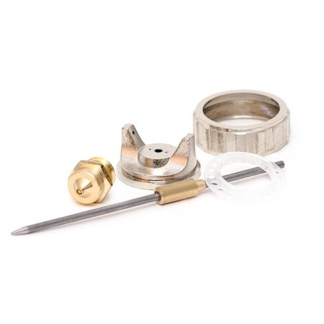 Змінний комплект складається з дюзи, повітряної голівки, голки та прокладки. Залежно від в'язкості матеріалу Ви можете вибрати різну діаметру форсунку 1,3; 1,5; 1,8; 2,0; 2,2; 2,5мм. Цей набір також може використовуватись як заміна зношених деталей Вашого фарбопульта. Підходить до фарборозпилювачів системи HP, а саме до PT-0204, PT-0205, PT-0210, PT-0211.