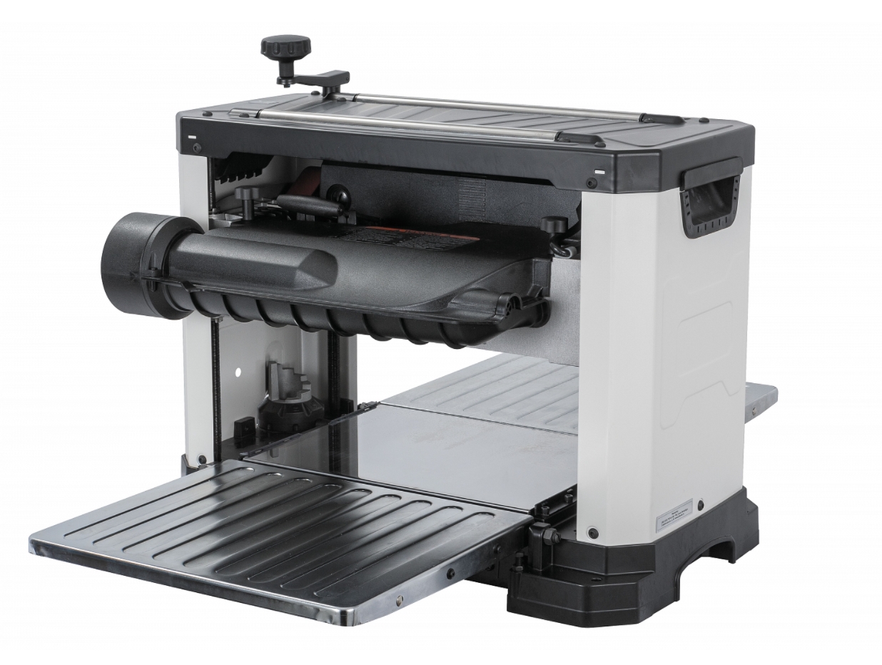JWP-13HH сучасний рейсмусовий верстат компактного класу із сегментованим ножовим валом шириною 330 мм. Строгальний барабан обладнаний не прямими довгими лезами, а невеликими (14 мм завширшки) різальними сегментами, які встановлені по кілька штук у ряд. Ці ряди (всього їх 6) входять у заготовку послідовно, що знижує вібрації, шум та ударні навантаження. Одночасно підвищується якість стругання – кожен ніж видаляє не цілісний «пласт» по всій ширині заготовки, а вузьку (14 мм) смугу, що набагато зменшує ймовірність вириву ділянок свердловини деревини. При цьому процесі утворюється дрібна стружка, зручна для відведення та утилізації.