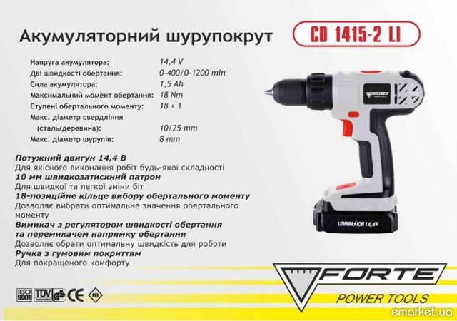 Яку ціну ви готові заплатити за те, щоб бабусиний годинник висіли на стіні? А скільки сотень викладете за те, щоб закріпити аркуш гіпсокартону? Подивимося правді у вічі: я не готовий віддавати стан за побутовий прилад, від якого хочу не так. вже багато - закрутити шуруп, просвердлити отвір, розлити сусідів. Нічого складного, чи не так? Нічого складного для Forte CD 1415-2 LI. Простий і чесний, як роботяг з провінції - без проблем зробить те, чого Ви від нього очікуєте і не спустошить Ваш гаманець.