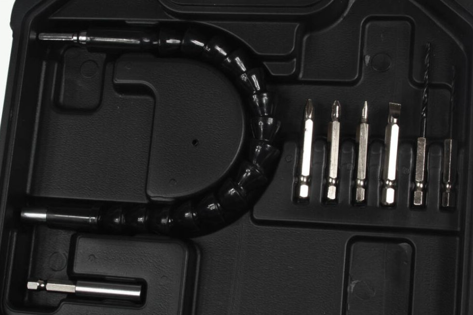 У комплекті до шуруповерта входять різні насадки та біти, що дозволяє швидко та зручно виконувати різні завдання. Гнучкий подовжувач у комплекті допоможе отримати доступ до важкодоступних місць.