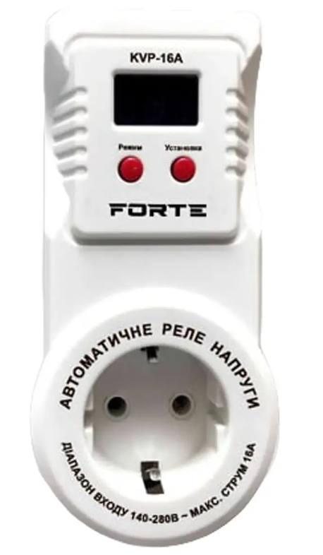 Автоматичне реле напруги Forte KVP-16A - пристрій призначений для захисту електроприладів від занадто низької або високої напруги в мережі, при короткому замиканні, перевантаженні і т. д. Модель Forte KVP-16A має зручне кнопкове керування з відображенням напруги на РК-дисплеї. Монтується прилад у євророзетку. При включенні пристрою модель KVP-16A заміряє напругу і у разі допустимих параметрів мережі включає навантаження.