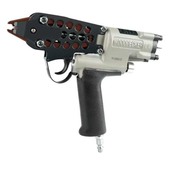 Промисловий скобозабивний пневмопістолет під С-скобу Woodpecker BWG12 з коротким носиком та закриттям скоби 1,8-2,1 мм та ємністю магазину 100 скоб. Інструмент має надійний та міцний алюмінієвий корпус із прогумованою ручкою для комфортної роботи. Внутрішній бік скоби 8,8 мм, а зовнішня – 11,4 мм. Використовується для скріплення кільцями, ідеально підходить для робіт, що вимагають надійного фіксування матеріалів із малим діаметром замикання. Пневматичний кільцевий пістолет BWG12 має загартовані затискні губи для стійкості затиску, чутливий курок та потужний циліндр для високої продуктивності.