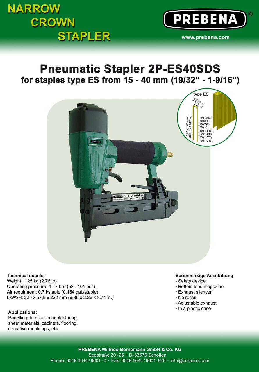 Каркасник 2P-ES40SDS призначений для монтажу панелей, дерев'яної підлоги, виробництва меблів, виготовлення упаковок та дерев'яних ящиків. Використовує 2P-ES40SDS-скобу ES.
