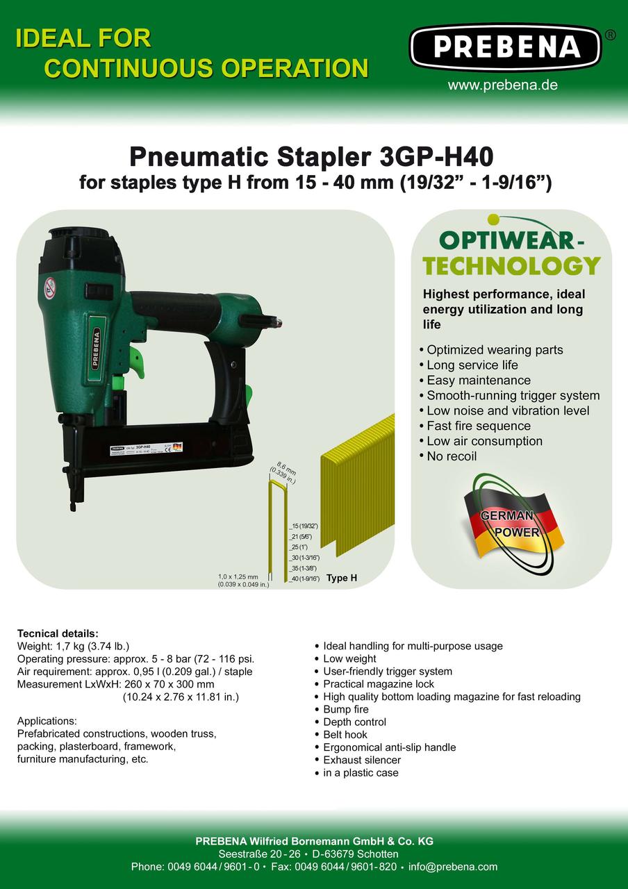 Опис PREBENA 3GP-H40 каркасний скобозабивний пневмопістолет