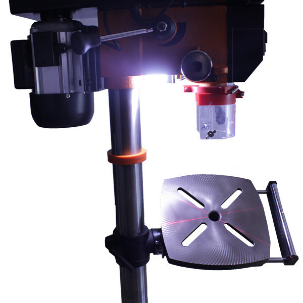 Максимальну 80 мм глибину опускання можна зменшувати регулюючи гвинт на рукояті подачі шпинделя і контролюючи значення за шкалою. Відкидний захисний прозорий щиток складається з двох половинок, при цьому глибину опускання нижньої можна регулювати. На настільному свердлильному верстаті WorkMan DP12VL встановлений асинхронний електродвигун потужністю 550 ват.