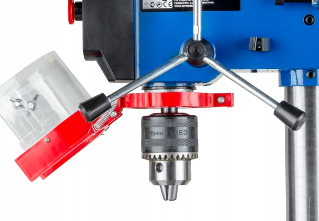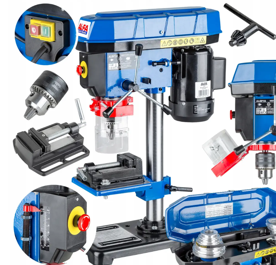 Свердлильний верстат AL-FA ALDP16 - ідеальний верстат для вимогливого майстра. Цей надійний верстат оснащений двигуном потужністю 1600 Вт та 5 різними налаштуваннями швидкості з максимальною швидкістю 2500 об/хв. Інструмент дозволяє отримати найкращі результати під час використання таких матеріалів, як сталь та дерево. Використовуйте затискний патрон для надійного кріплення різних типів свердлів (макс. Ø свердла: 16 мм). Клиноремінна передача знаходиться зверху машини, добре захищена в металевому корпусі. Коли корпус відкритий, запуск двигуна неможливий з міркувань безпеки. Завдяки червоній аварійній кнопці та прозорій захисній кришці можна працювати безпечно. Робочий стіл регулюється по висоті, може бути нахилений на кут від 0 до 45°. Крім того, обмежувач глибини свердління дозволяє точно визначити, як глибоко має проходити свердло у матеріалі (максимальна глибина отвору: 52 мм). Оскільки опорна плита оснащена отворами різьбовими, можна легко прикріпити перфоратор до робочого столу.
