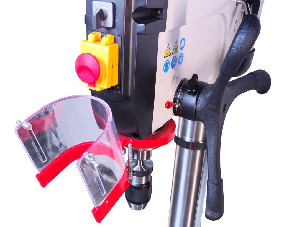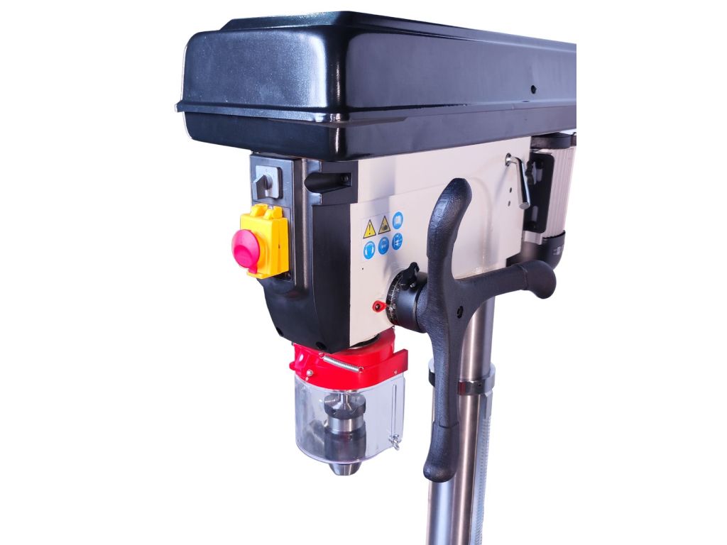 - Потужний двигун: Верстат оснащений двигуном потужністю 1500 Вт, що дозволяє йому з легкістю справлятися зі свердлінням отворів у твердих металевих матеріалах. Завдяки цій потужності, максимальний діаметр свердління досягає 32 мм, що робить верстат ідеальним для роботи з масивними та товстими заготовками.