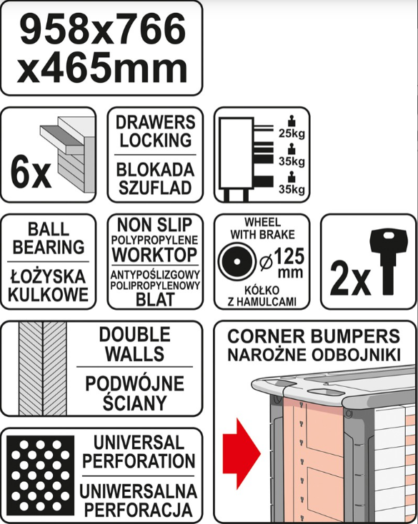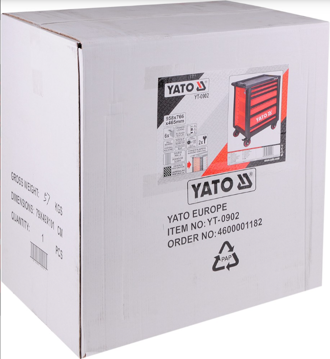 Опис Інструментальний візок з 6 ящиками, YT-0902 YATO Інструментальний візок з 6 ящиками YATO YT-0902 Торгова марка: YATO (Польща) Країна виробник: Тайвань Опис/Характеристики: Опис продукту Szafka serwisowa marki YATO. Posiada 6 szuflad на prowadnicach kulkowych. Profil wykonane z podwojnej blachy stalowej. Центральний замок оraz indywidualne zamkniecie dla kazdej szuflady. Szafka posiaada narozniki odbojniki, які chronia przed przypadkowym uszkodzeniem, np. karoserii samochodu. Блат wykonany з поліпропилену, wytrzymuje obcazenie 450 kg. Niezbedna w warsztatach samochodowych i stacjach obslugi pojazdow. Технічні характеристики Символ YT-0902 EAN 5906083909023 Марк Yato Jednostka SZT Waga brutto (kg) 60.0000 Master Carton MC 1 Pal 2 Матеріал сталевий лист Ilosc szuflad 6 Rozmiar [cm] 95,8x76,6x4 сталь, високоякісні технічні характеристики продуктів YATO, які пропонують три напрями: служба, будівельні та садові. Ручні та пневматичні інструменти YATO успішно використовуються фахівцями в багатьох галузях економіки. Виняткові довговічність і міцність привертають YATO для використання в інтенсивних промислових та обслуговування. Характеристики Інструментальний візок з 6 ящиками, YT-0902 YATO Дані виробника Країна виробник: Тайвань