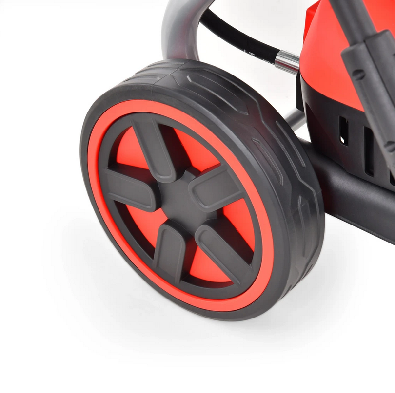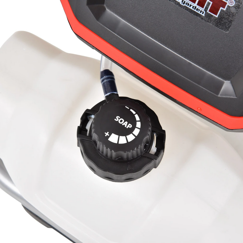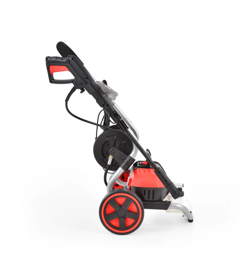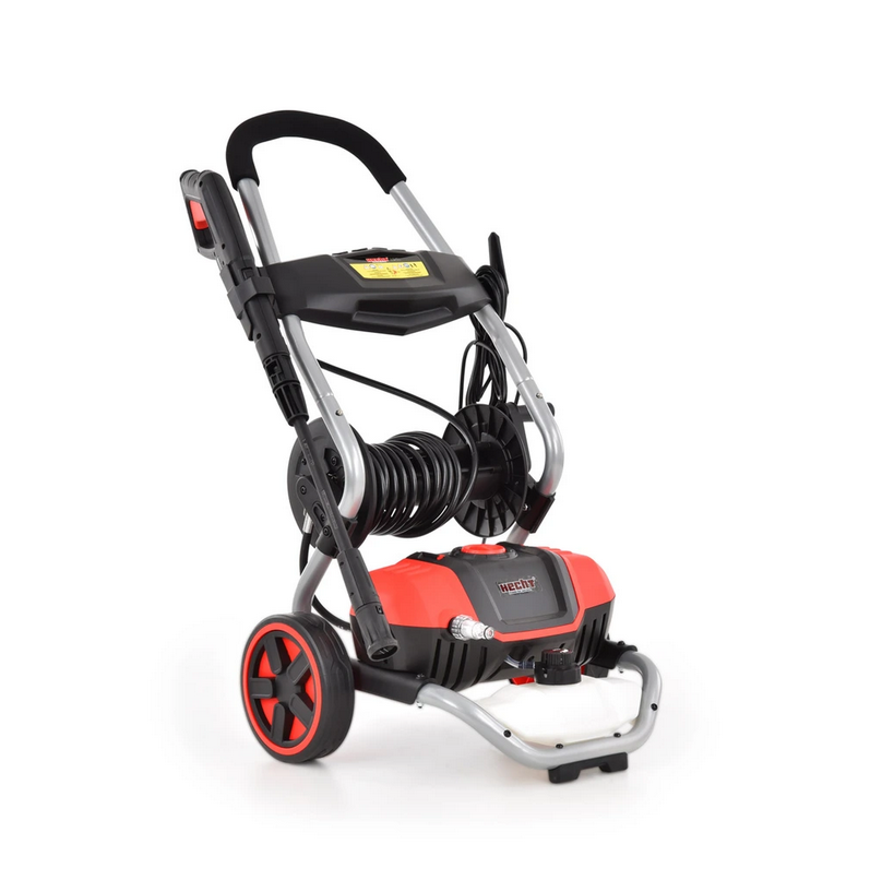 Мийка високого тиску з барабаном та тримачами аксесуарів. Ідеально підходить для очищення автомобілів, мотоциклів, велосипедів, причепів, тротуарів, фасадів, зовнішніх вікон та дверей, дахів, басейнів, теплиць або садових меблів. Потужність 1800 Вт, робочий тиск 100 бар. Залежно від налаштування форсунки потік води досягає 420 л/година. Вага 12,5 кг. Живиться розетка 230 В/50 Гц. Постачається з напірним шлангом довжиною 5 м і пістолетом з регульованою насадкою.