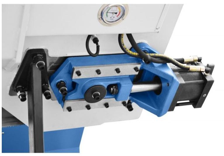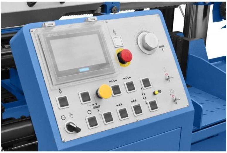 Опускання та підняття голови здійснюється гідравлічно з плавним регулюванням швидкості опускання. Подача також керується гідравлікою та проводиться з точністю до +/- 0,2 мм за один хід. Максимальна довжина подачі – 500 мм. Для надійної фіксації заготовок є гідравлічні лещата. Для живлення гідравлічної системи використовують окремий двигун потужністю 1,5 кВт. З панелі керування, оснащеної сенсорним РК-дисплеєм, можна налаштувати кількість заготовок, їх довжину та швидкість різання. Ця пила металорізальна автоматична має жорстку колонну конструкцію, що дозволяє з високою точністю різати всі види металів.