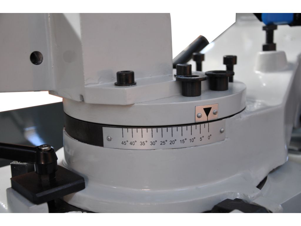 Здатність різати під кутами є незамінною функцією верстата, дана модель обладнана поворотними тисками. Завдяки простоті конструкції має більш доступну ціну в порівнянні з пилами з поворотною ріжучою головою. Використовується на виробництвах, де проводиться різ як правило під прямим кутом і іноді під іншими кутами.