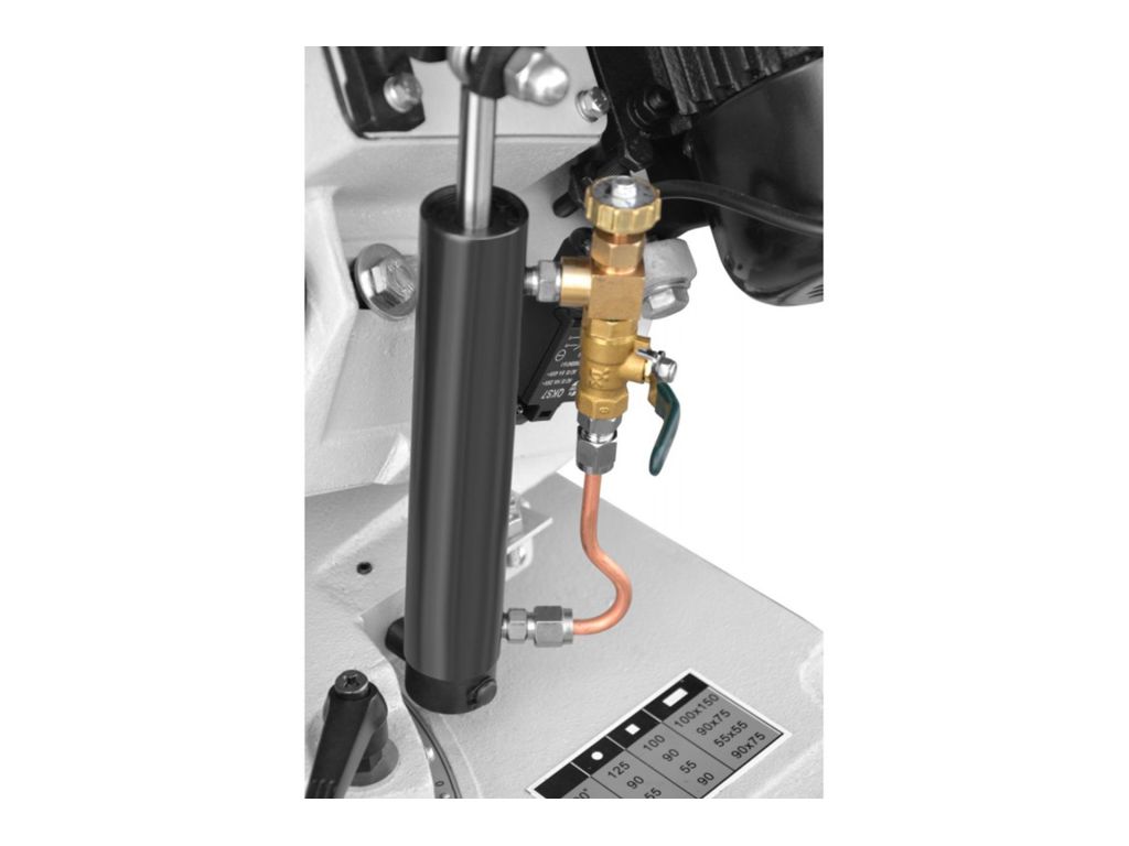 Для кращої ефективності та полегшення роботи оператора ріжуча голова обладнана гідроциліндром. Він використовується для опускання голови стрічкової пилки, забезпечують плавне та контрольоване опускання голови стрічкової пилки, що дозволяє точно контролювати процес різання. Також гідроциліндр дозволяє зафіксувати ріжучу голову на будь-якій зручній для конкретної заготовки висоті, щоб початок опускання голови відбувалося безпосередньо над заготівлею, а не крайнього верхнього положення.