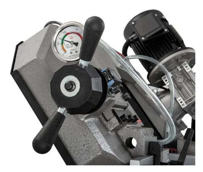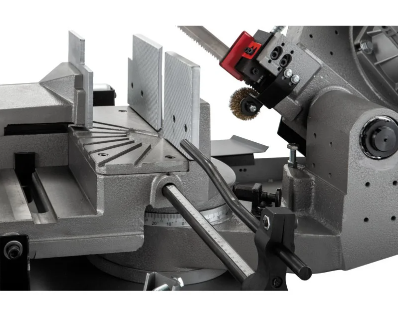 - Гідравлічні лещата з широкими рифленими губками для швидкого та надійного затискання заготовки. Тиски легко переміщаються паралельно до заготівлі і дають можливість пиляти під різними кутами