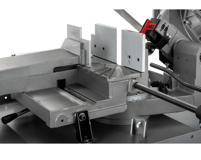 Стрічковопильний верстат обладнаний гідравлічними лещатами з широкими рифленими губками для швидкого та надійного затискання заготовки. Тиски легко переміщаються паралельно до заготівлі і дають можливість пиляти під різними кутами. Додатково встановлена вхідна роликова опора для полегшення встановлення та переміщення важких деталей. Регульований кінцевий упор з лінійкою, що легко читається, використовується при проведенні серійних робіт.