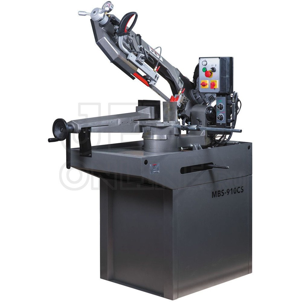 Стрічковопильний верстат MBS-910CS є традиційною моделлю верстатів європейського типу, призначених для промислового використання. Верстат розрахований на пиляння круглих металевих заготовок під прямим кутом максимально допустимого діаметра 225 мм. Особливості конструкції полягають у можливостях повороту пильної рами для обробки заготовок під різними кутами. Кут повороту пиляльної рами вправо становить 60 0. Максимальний діаметр заготовки для розпилу під кутом 45 0 складає 160 мм, при встановленні консолі під кутом 60 0 – 90 мм. Верстат MBS-910CS обладнаний системою гідророзвантаження, за допомогою якої здійснюється опускання консолі. Підняття консолі забезпечується оператором за допомогою роботи пружини-компенсатора. Наявність гідроциліндра дозволяє регулювати швидкість подачі рами до зони різання.
