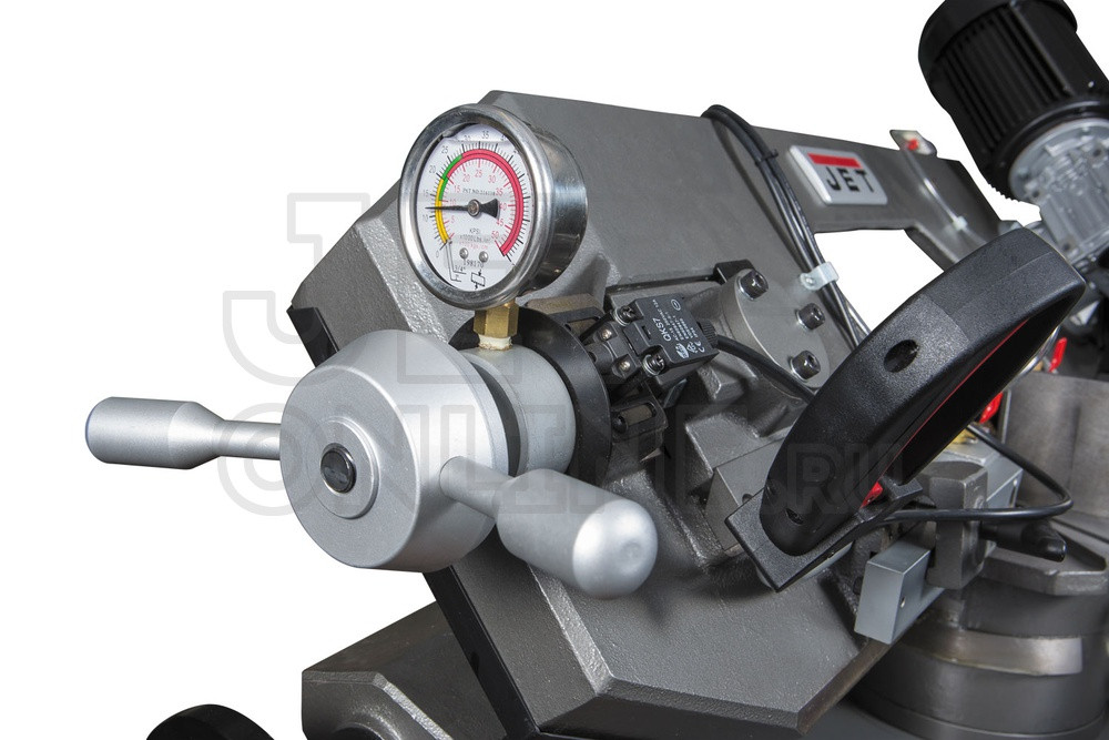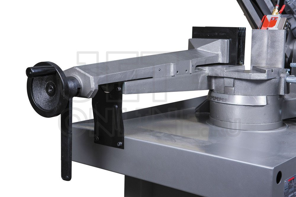 Стрічковопильний верстат обладнаний швидкозатискними лещатами, використовуючи які можна досягти високої продуктивності робіт. Консоль верстата має напрямні, пересування яких дозволяє регулювати прохід стрічкового полотна, підвищити якість розпилу та обмежити уведення полотна убік. Напрямні оснащені підшипниками, що виконують функцію позиціонування стрічкового полотна у вертикальному положенні щодо оброблюваної заготовки. Верстат має тензометр, що фіксує силу натягу стрічкового полотна. Регулювання сили натягу здійснюється вручну.