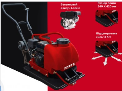 Віброплита Forte PC54 TWP Віброплита PC 54 TWP - якісна бензинова модель, яку використовують для роботи на будівельних майданчиках, укладання і ремонту доріг. Модель використовують для роботи з м'якими грунтами, піском і гравієм. Віброплита оснащена потужним двигуном Loncin 200F об'ємом 196 л / с. Розмір плити 540х420 мм підходить для укладання асфальтного покриття, ландшафтних робіт. Для уникнення налепанія покриття на підошву плити передбачений бак для води. Відцентрова сила моделі становить 13 КН. Швидкість віброплити 10 м / хв, а частота удару в хвилину 5500. Для зручності використання в комплект додається гумовий килимок.