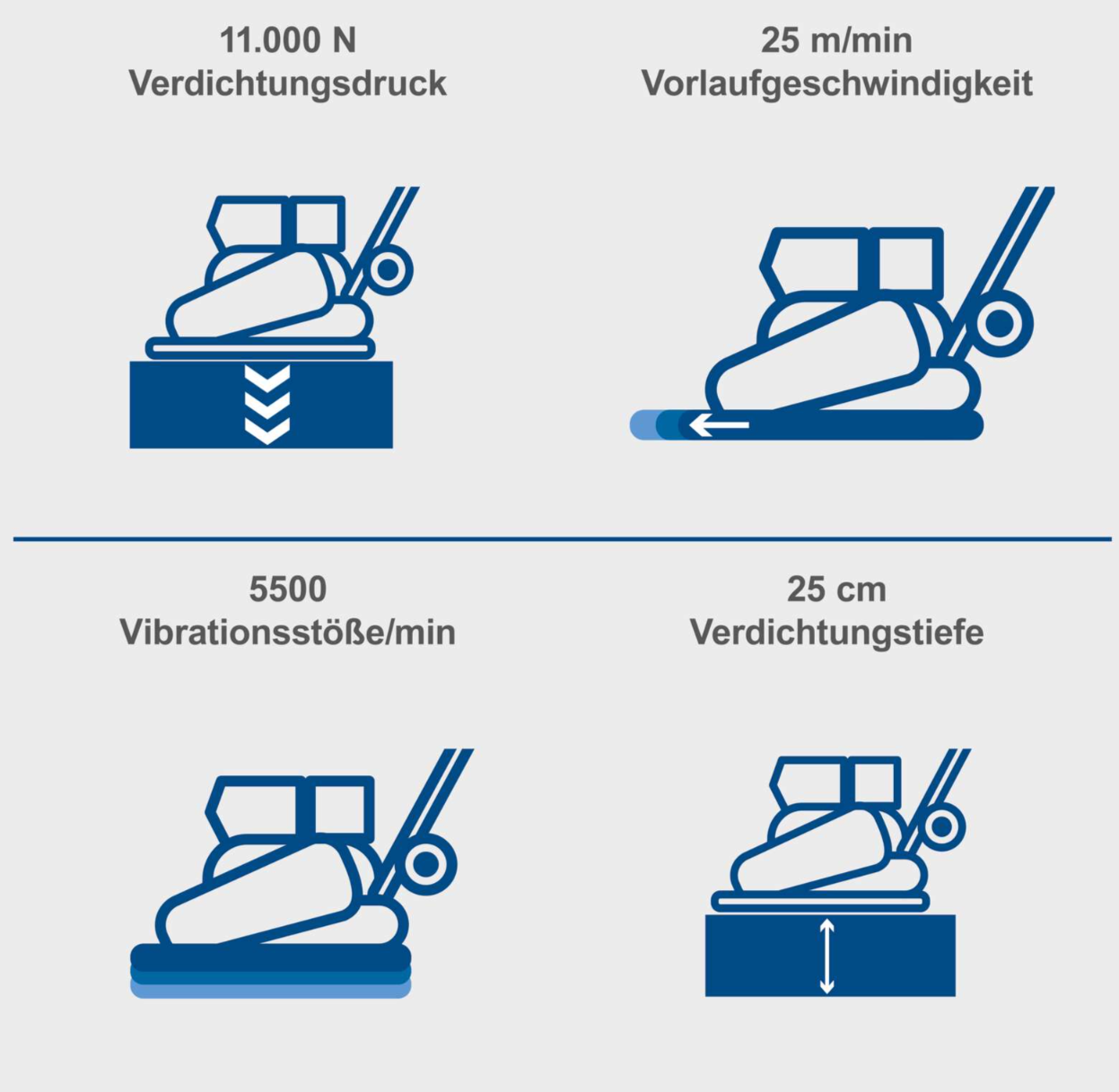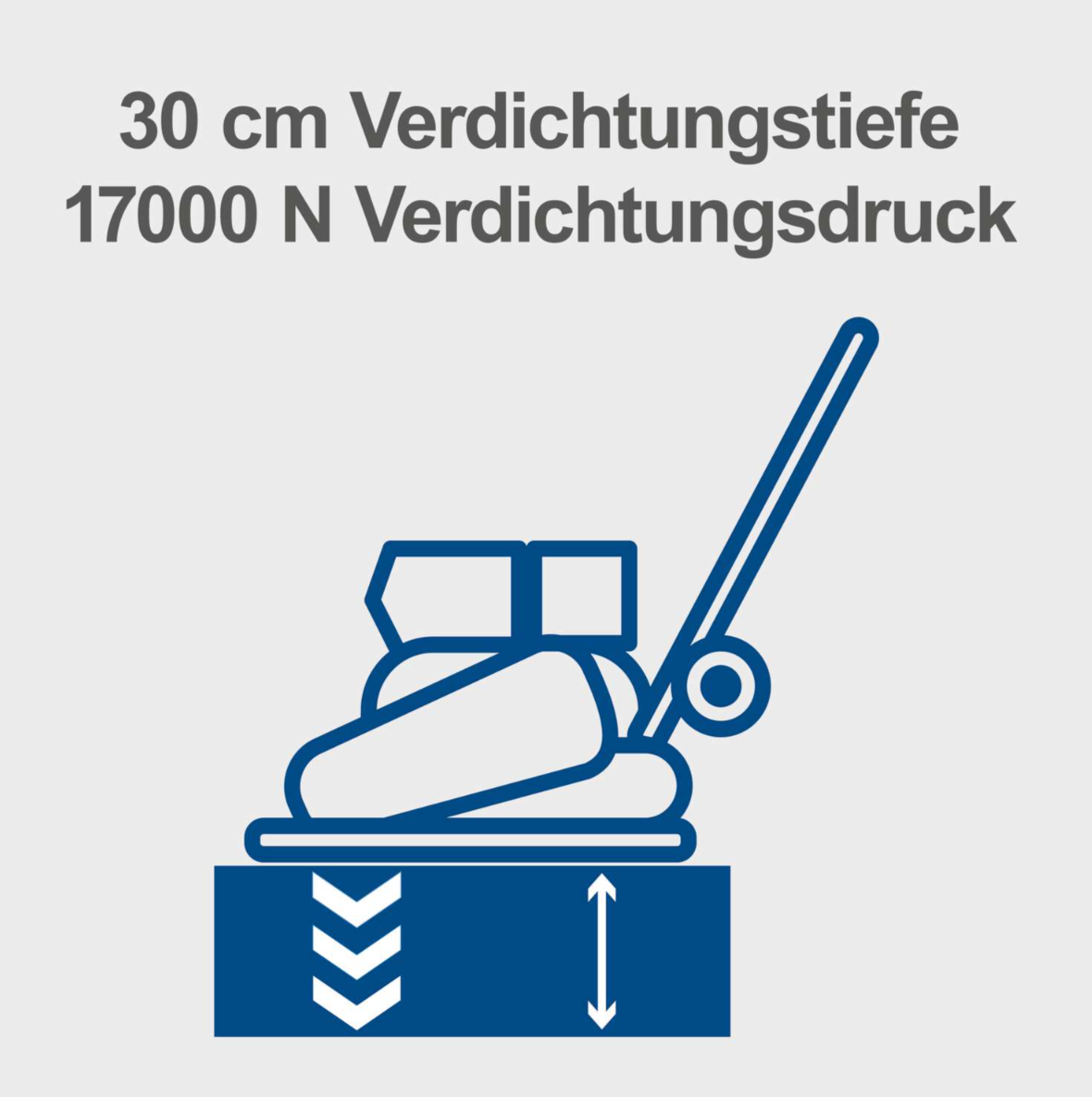 Сила ущільнення досягає 17 кН, що дозволяє ефективно працювати з різними типами поверхонь від піску до щільного грунту. Робоча глибина ущільнення становить до 30 см, забезпечуючи якісну підготовку основи під укладання плитки, асфальту чи фундаменту.