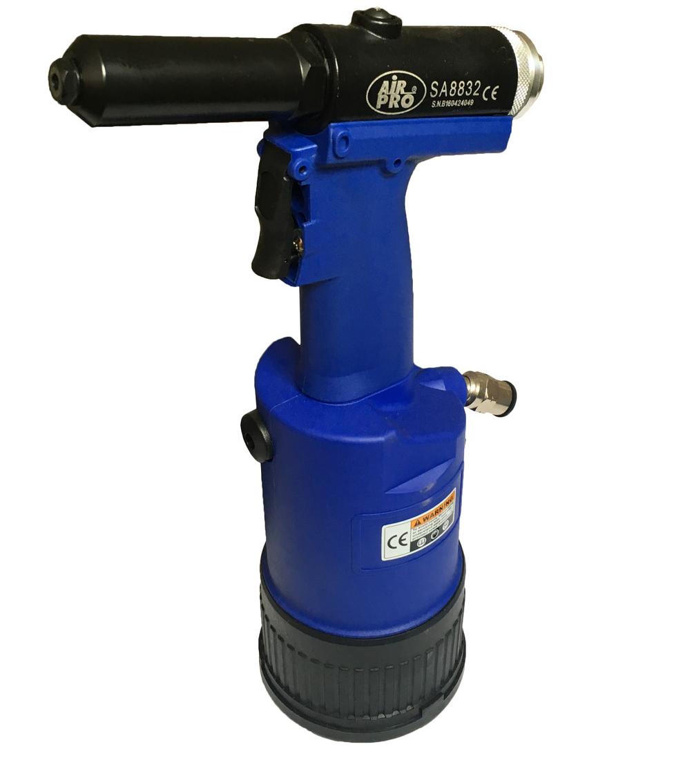 Опис товару Особливості: легкий промисловий пістолет для заклепок з діапазоном діаметрів 3,2 - 6,4 мм. Характеристики товару Бренд AirPro Діаметр заклепки 3,2/4,0/4,8/6,4 мм Матеріал заклепки алюміній Потужність 1600 кг/фут Витрата повітря 2,5 л/цикл Рекомендований внутрішній діаметр шланга 8 мм Вага 1,7 кг