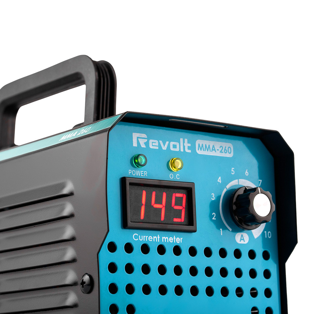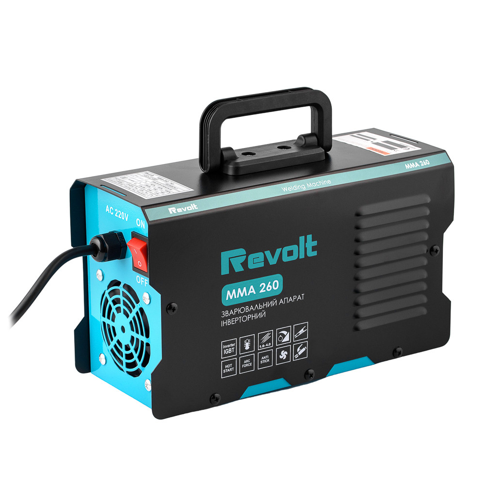 Зварювальний апарат інверторного типу Revolt MMA-260 призначений для ручного дугового зварювання різних типів металів штучним електродом, методом ручного дугового зварювання на постійному струмі. Revolt MMA-260 розрахований для побутового та напівпромислового використання. Завдяки додатковому регулюванню можна налаштовувати оптимальні параметри у різних ситуаціях. Має невелику вагу, зручну для транспортування. Великою перевагою інверторного апарату є робота зі зниженою напругою в мережі. В умовах частої нестабільності напруги в стаціонарних мережах цього пристрою буде достатньо навіть 160 для нормальної роботи. Особливості Цифровий дисплей Захист від термічного перевантаження Покращений тримач маси та електродів MIG/MAG/MMA-зварювання Функції Anti Stick, Hot Start, Arc Force Вага: 4 кг Потужність: 5000 Вт Робоча напруга: 160-250 В Діаметр електро. мм Регулювання зварювального струму: 20-260 А Робочий цикл (при 30°C): 100% ККД: 85% Клас ізоляції: F Ступінь захисту: IP21S